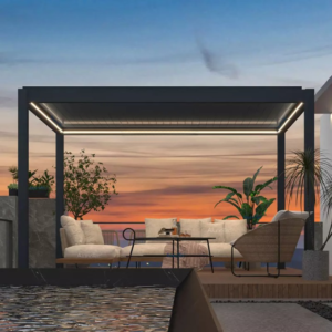 PERGO-ECO combines unique hollow flat blades with architectural aesthetics to completely block rain from entering after all louvers are closed.It’s a new generation of outdoor sunshade louvers based on all-aluminum technology which can withstand 28m/s windy conditions. Modern frame&post design and movable louvers reveal the relentless pursuit of high quality life style.